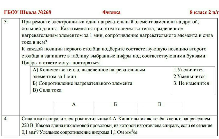 При ремонте электроплитки один нагревательный элемент заменили на другой, большей длины. Как изменится при этом количество тепла, выделяемое нагревательным элементом за 1 минуту, сопротивление нагреваемого элемента и сила тока в нём? К каждой позиции первого столбца подберите соответствующую позицию второго столбца и запишите выбранные цифры под соответствующими буквами. Цифры в ответе могут повторяться.