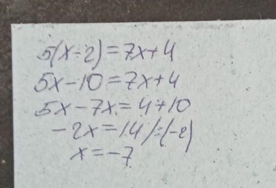 я бы так написала 5(×-2)=7×+4 5×-10=7×+4