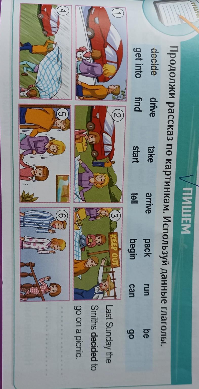 Продолжи рассказ по картинкам. Используй данные глаголы. decide drive take arrive pack be find start tell begin go run get into can. (начало)Last Sunday the Smiths decided to go on a picnic.