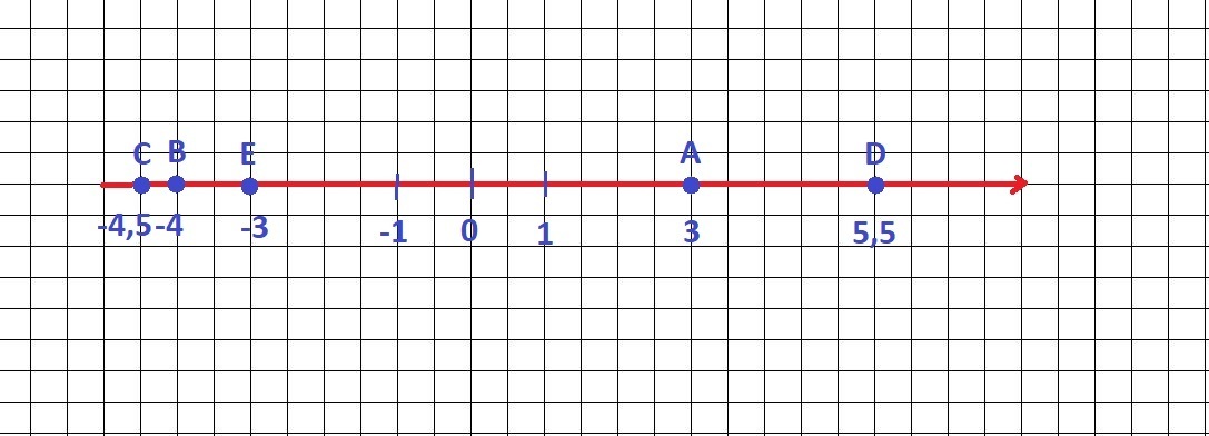 Отметьте на координатной прямой точки А (3), B (— 4), C (— 4,5), D (5,5), E (—3). Какие из отмеченных точек имеют противоположные координаты?