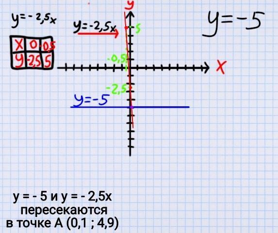 Побудуйте в одній системі координат графіки функцій у=-2,5х та у=-5 і знайдіть координати точки їх перетину
