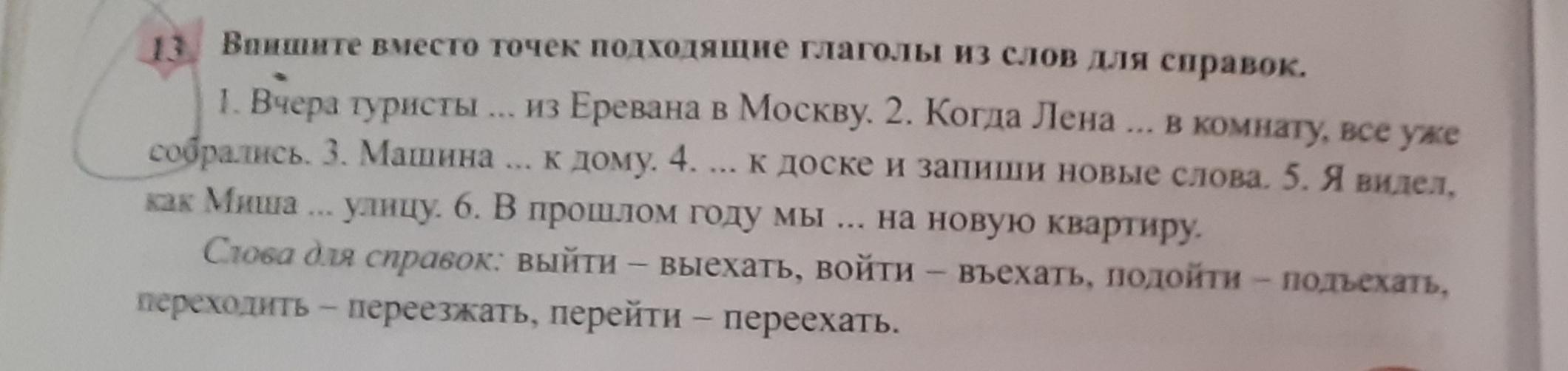 1. выехали. 2. вошла. 3. подъехала. 4. выйди. 5. переходил. 5. переехали
