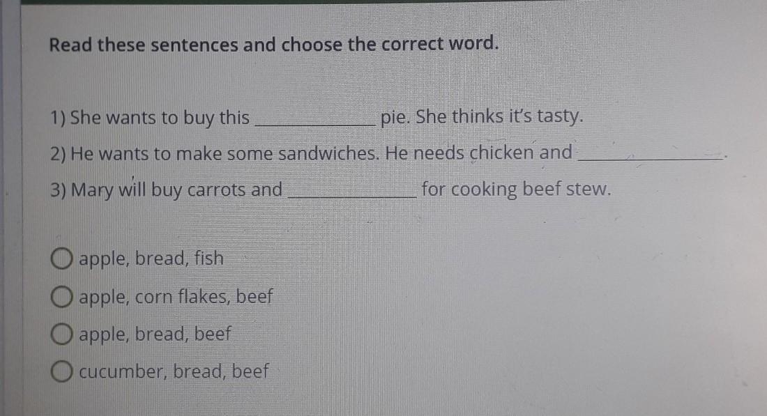 Read these sentences and choose the correct word. 1) She wants to buy this pie. She thinks it's tasty. 2) He wants to make some sandwiches. He needs chicken and 3) Mary will buy carrots and for cooking beef stew. O apple, bread, fish O apple, corn flakes, beef O apple, bread, beef O cucumber, bread, beef