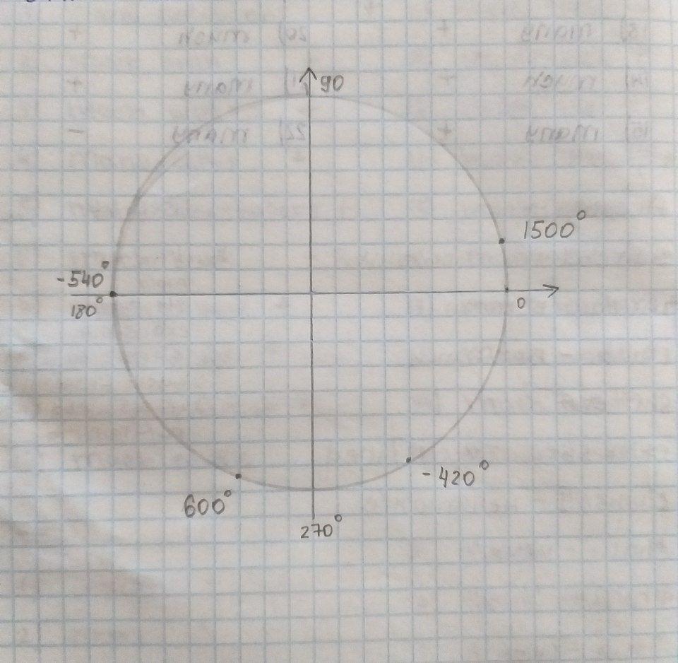 4. (необязательно) Отметить на единичной окружности точки, соответствующие углам 1500°, -420°, 600°, -540°