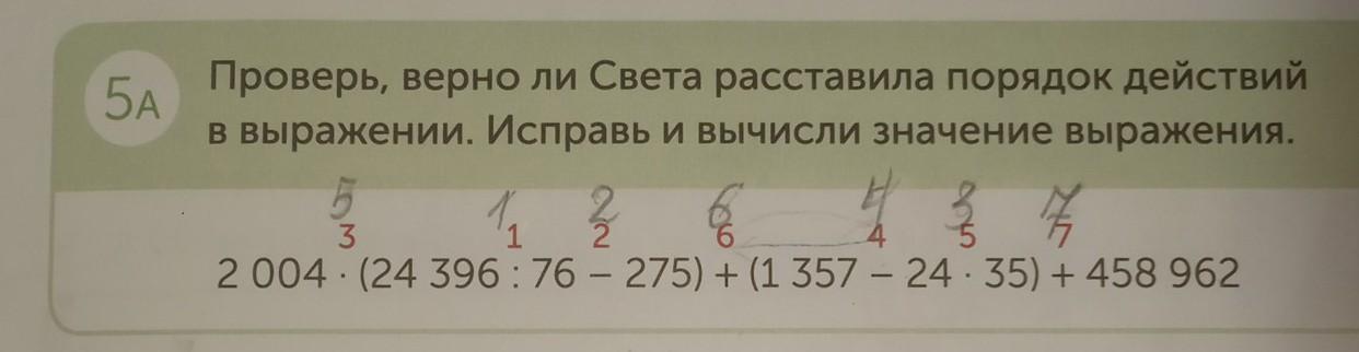 5A Проверь, верно ли Света расставила порядок действий в выражении. Исправь и вычисли значение выражения. 6 1 3 2004. (24 396:76 - 275) + (1 357 - 24. 35) + 458 962 1 3