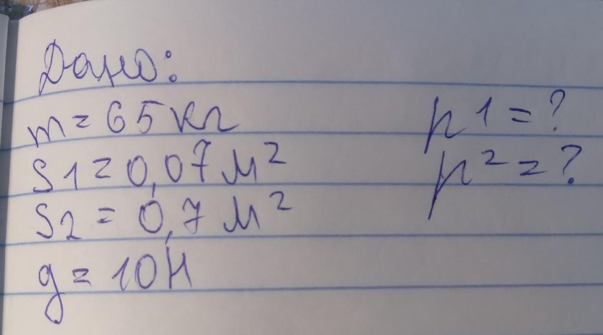 Даю 30 баллов. Вес человека 65 кг, если известно что площадь подошвы 0, 07 м² и площать 0, 7 м², тогда какая будет сила давления на лёд?