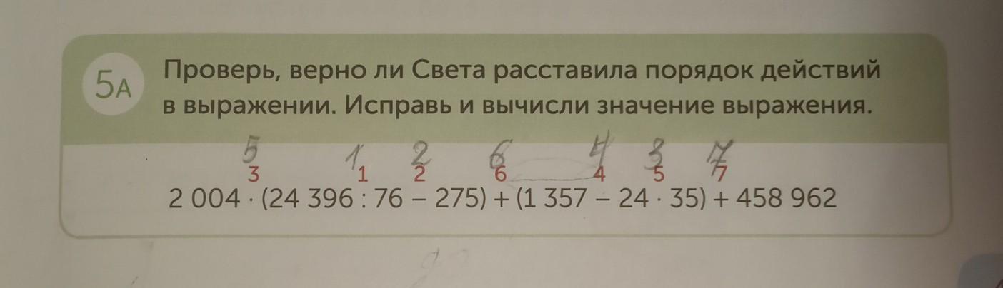 5A Проверь, верно ли Света расставила порядок действий в выражении. Исправь и вычисли значение выражения. 5 11 и 3 3 2004. (24 396:76 - 275) + (1 357 - 24 .35) + 458 962 можно на листочке столбиком даю 17 баллов
