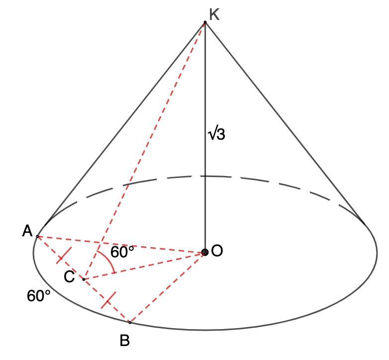хорда основания конуса стягивает дугу, градусная мера которой равна 60 градусов. отрезок, соединяющий вершину конуса с серединой данной хорды, образует с плоскостью основания угол 60 градусов. высота конуса равна √3. найдите объём конуса.