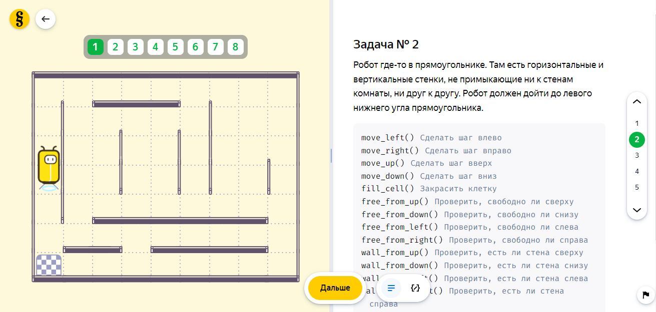 Робот где-то в прямоугольнике. Там есть горизонтальные и вертикальные стенки, не примыкающие ни к стенам комнаты, ни одна к другой. Робот должен дойти до левого нижнего угла прямоугольника.