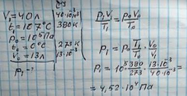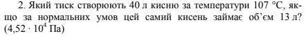 Який тиск створюють 40 л кисню за температури 107 °С, якщо за нормальних умов цей самий кисень займає об’єм 13 л?