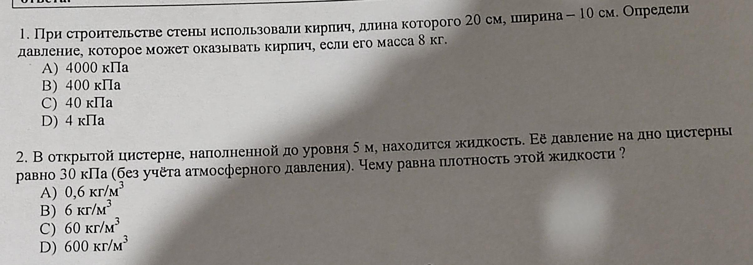 2)p=pgh=600кг/м3*10н/кг*5м3=30000Па=30Кпа(D)