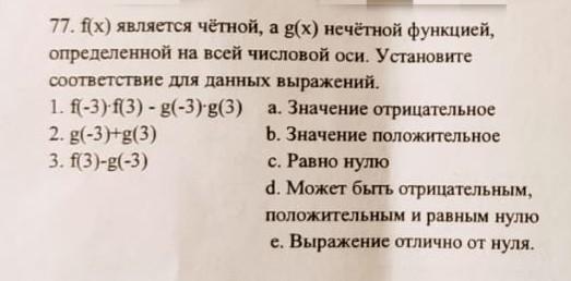 3. f(3)-g(-3)= f(3)+g(3), поскольку не известны знаки значений функций в точке 3, то сумма может быть как положительна, так и отрицательна, и даже равна нулю. поэтому ответ d