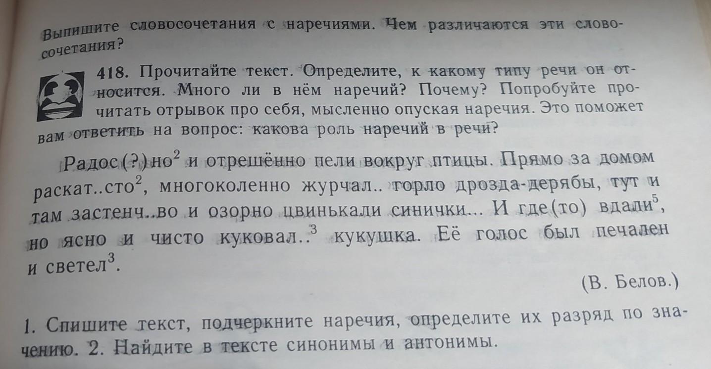 радостно, раскатисто, журчало, застенчиво, куковала,