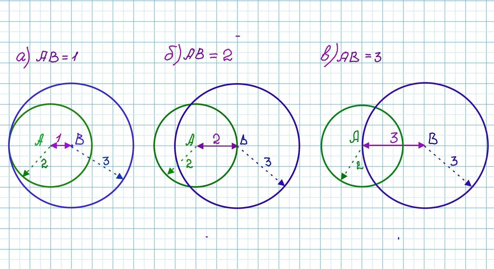 - Если расстояние между центрами двух окружностей меньше суммы их радиусов, то эти окружности пересекаются. Две общие точки. (5)