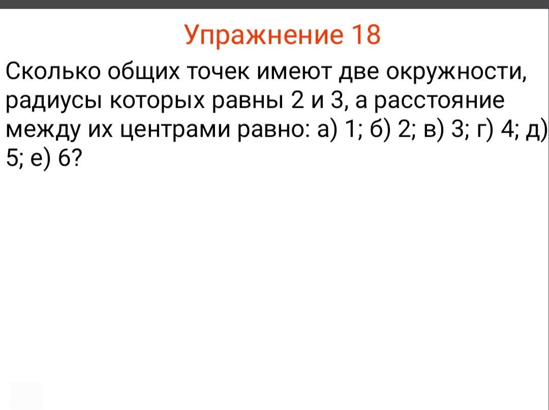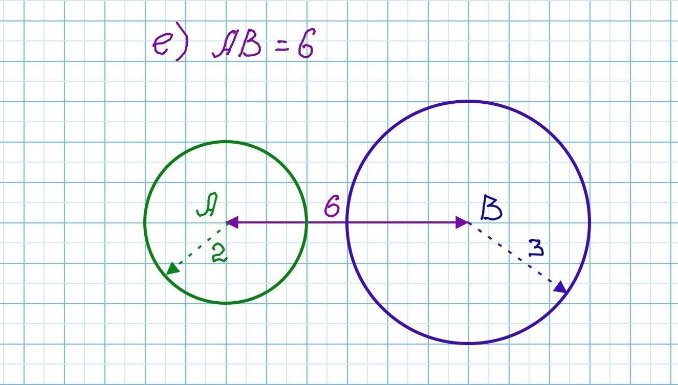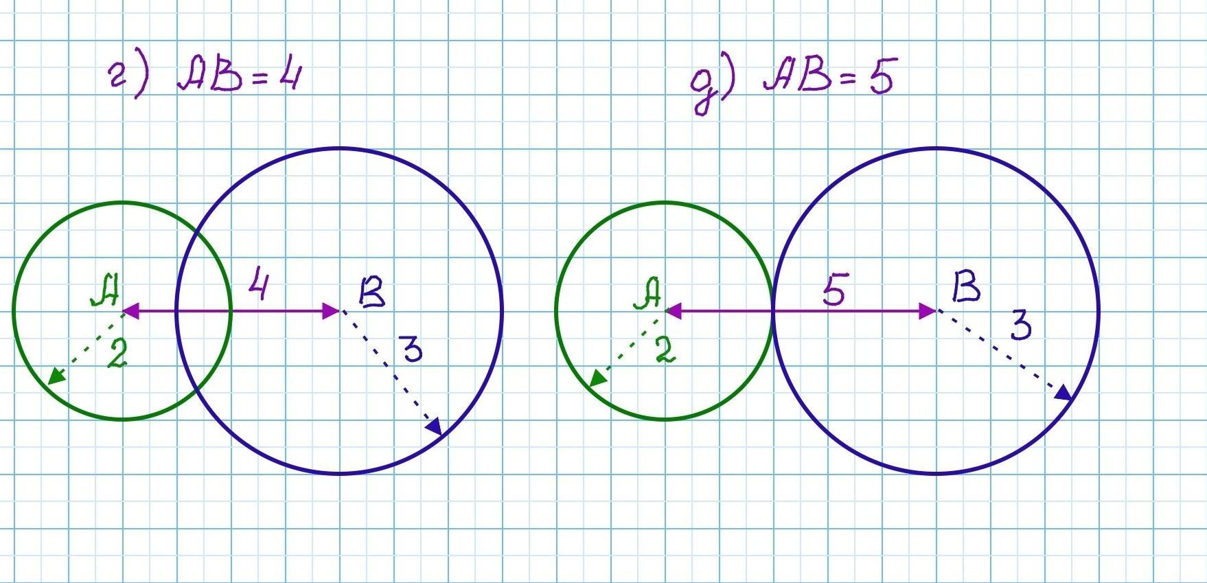 Сколько общих точек имеют две окружности, радиусы которых равны 2 и 3, а расстояние между их центрами равно: а)1 ; б)2 ; в)3 ; г)4 ; д)5 ; е)6 ?