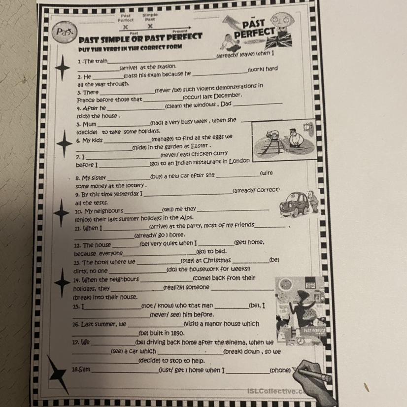 6. My kids managed to find all the eggs we had hidden in the garden at Easter. 7. I had never eaten chicken curry before I went to an Indian restaurant in London. 8. My sister bought a new car after she had won some money in the lottery. 9. By this time yesterday I had already corrected all the tests. 10. My neighbours told me they had enjoyed their last summer holidays in the Alps. 11. When I arrived at the party, most of my friends had already gone home. 12. The house was very quiet when I got home. 13. The hotel where we stayed at Christmas was dirty, no one had done the housework for weeks! 14. When the neighbours came back from their holidays, they realized someone had broken into their house.