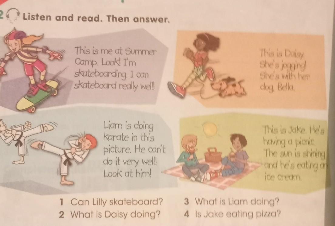 This is me at Summer Comp Look I'm skateboarding Icon skateboard redly wel This is Doisy. She's jogging She's with her dog Belo 2 Liam is doing karate in this picture. He can't do it very well Look at him! This is Jake Hes having a picnic The sun is shining and he's eating as ice cream 1 Can Lilly skateboard? 2 What is Daisy doing? 3 What is Liam doing? 4 Is Jake eating pizza?