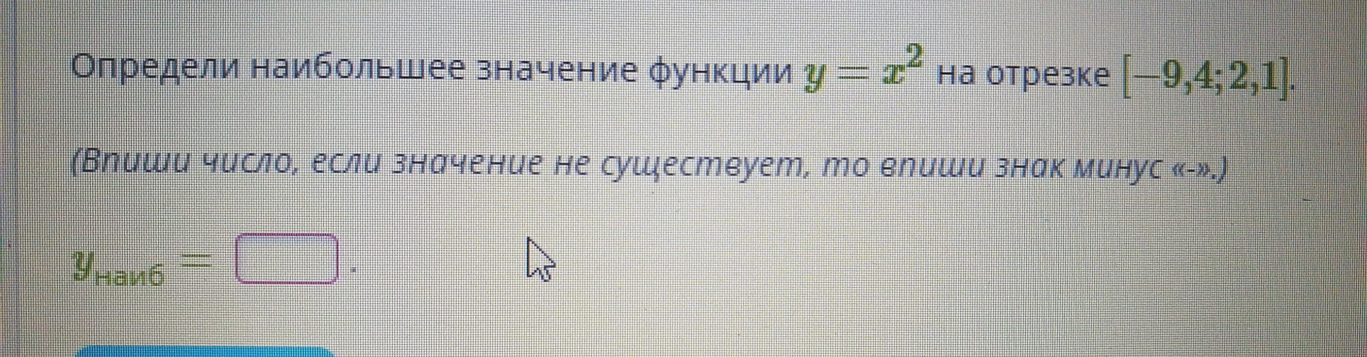 Определи наибольшее значение функции y = х на отрезке [9,4; 2,1).