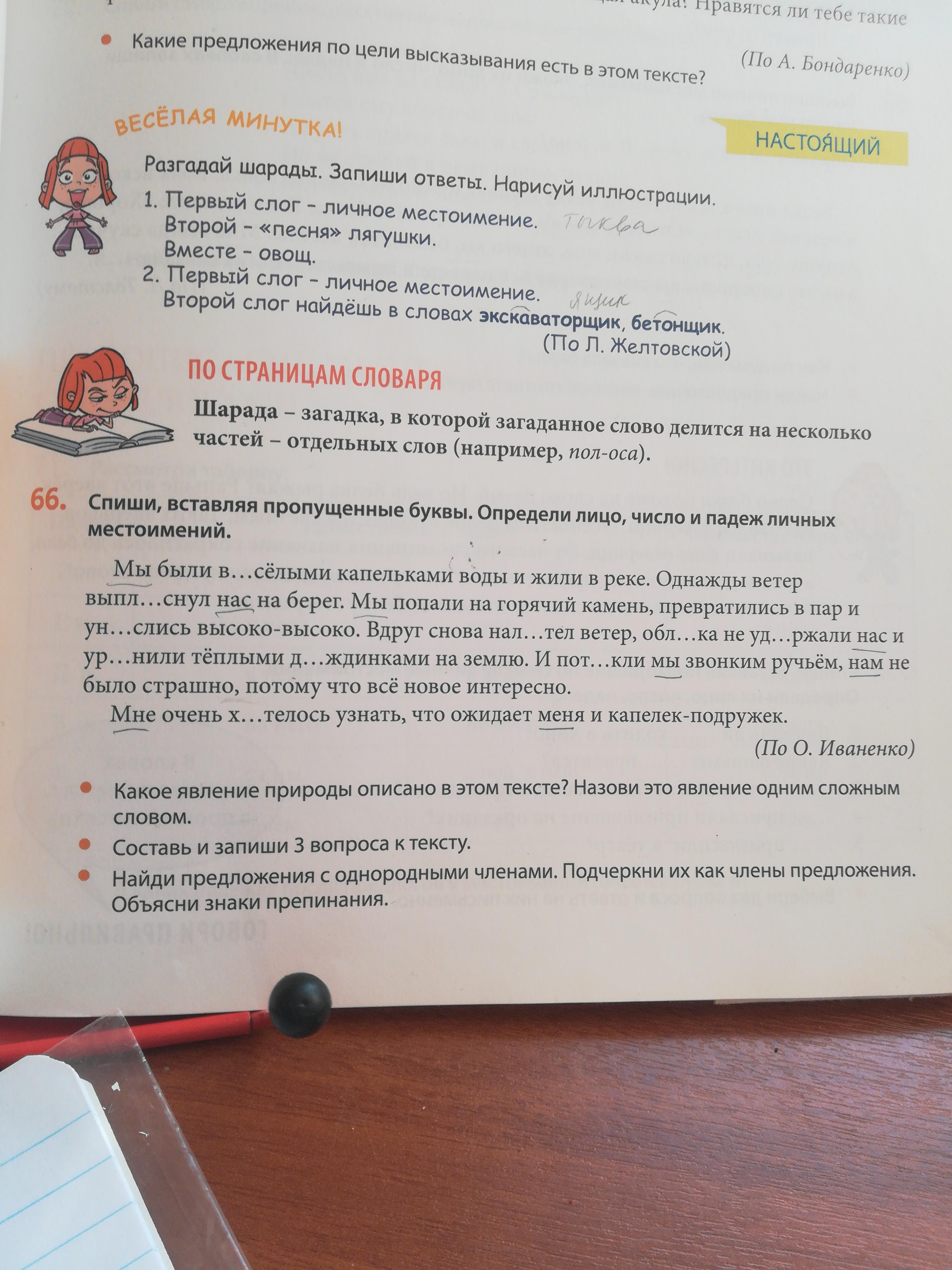 Мы (Именительный падеж, множественное число, 1 лицо) были весёлыми капельками воды и жили в реке. Однажды ветер выплеснул нас (Родительный падеж, множественное число, 1 лицо) на берег. Мы (Именительный падеж, множественное число, 1 лицо) попали на горячий камень, превратились в пар и унеслись высоко-высоко. Вдруг снова налетел ветер, облака не удержали нас (Родительный падеж, множественное число, 1 лицо) и уронили тёплыми дождинками на землю. И потекли мы (Именительный падеж, множественное число, 1 лицо) звонким ручьём, нам (Дательный падеж, множественное число, 1 лицо) не было страшно, потому что всё новое интересно.