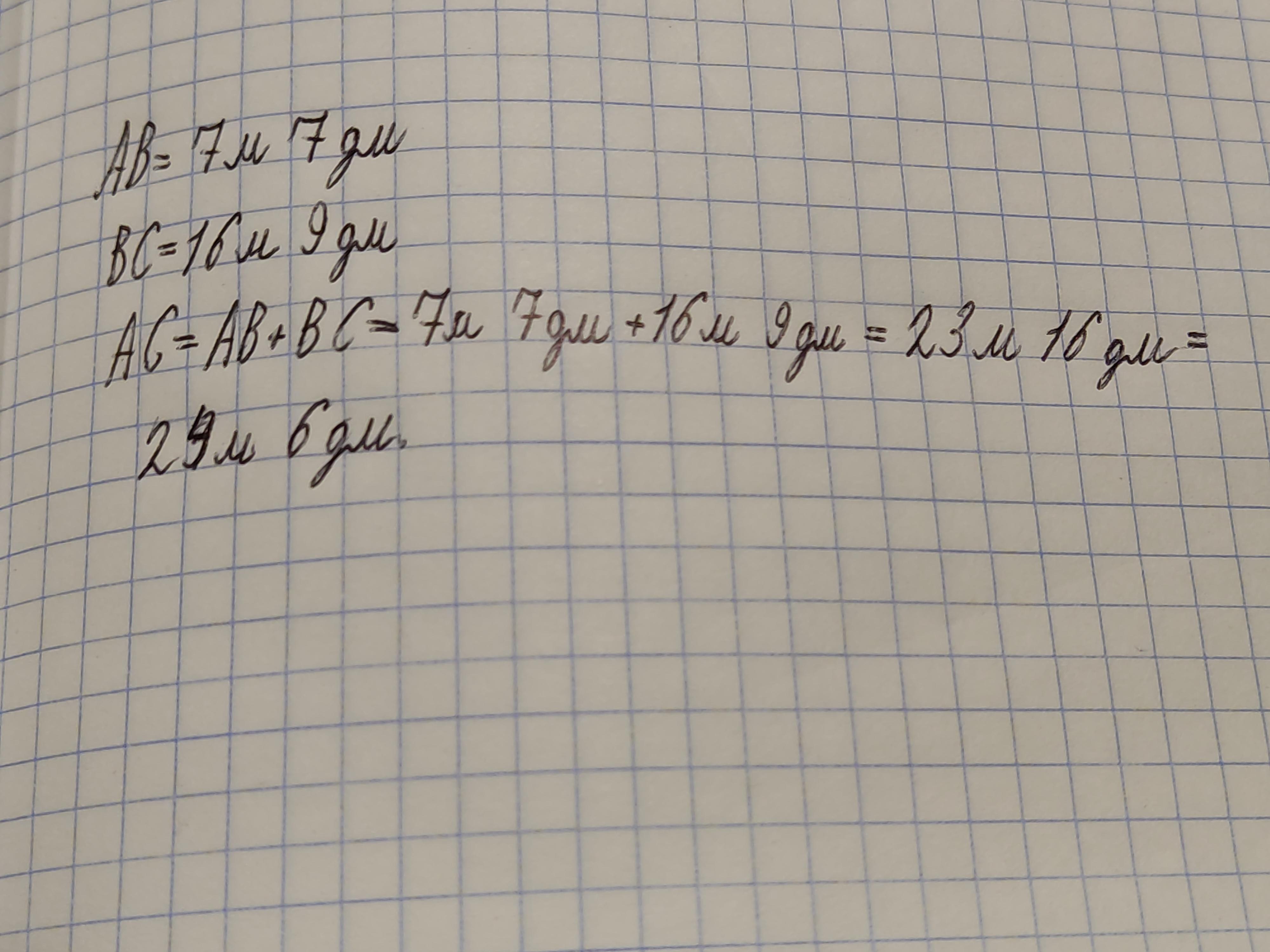 7 м 7 дм + 16 м 9 дм = 23 м 16 дм или 24 м 6 дм