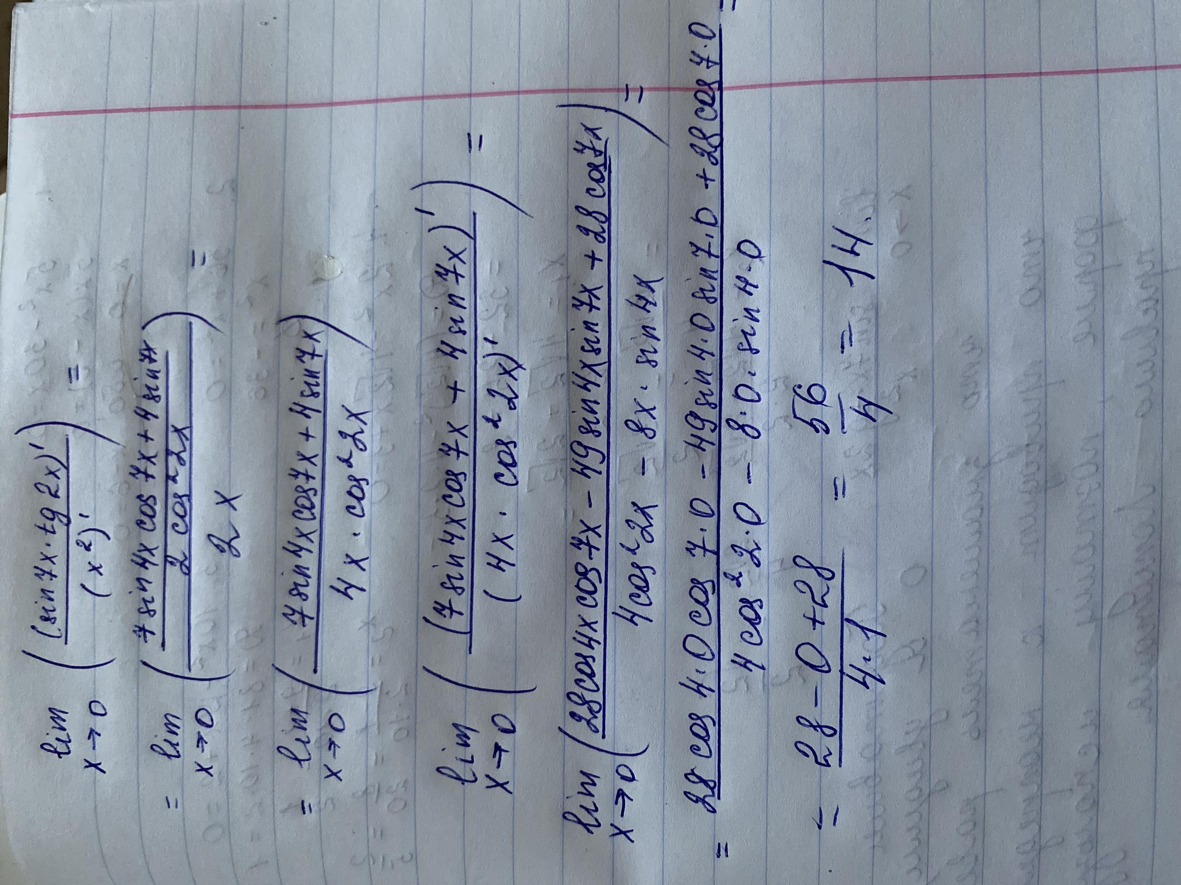 =14 lim (sin7x)/(7x) * lim (tg2x)/(2x)=