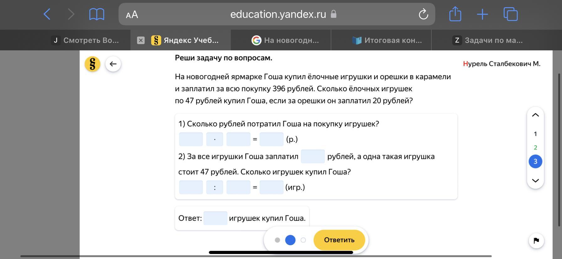 На новогодней ярмарке Гоша купил ёлочные игрушки и орешки в карамели и заплатил за всю покупку 396 рублей. Сколько ёлочных игрушек по 47 рублей купил Гоша, если за орешки он заплатил 20 рублей?