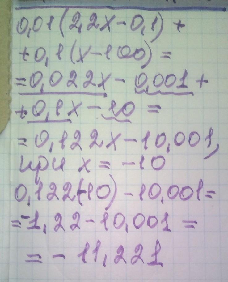 0,01(2,2x - 0,1) + 0,1(x - 100) при x= -10