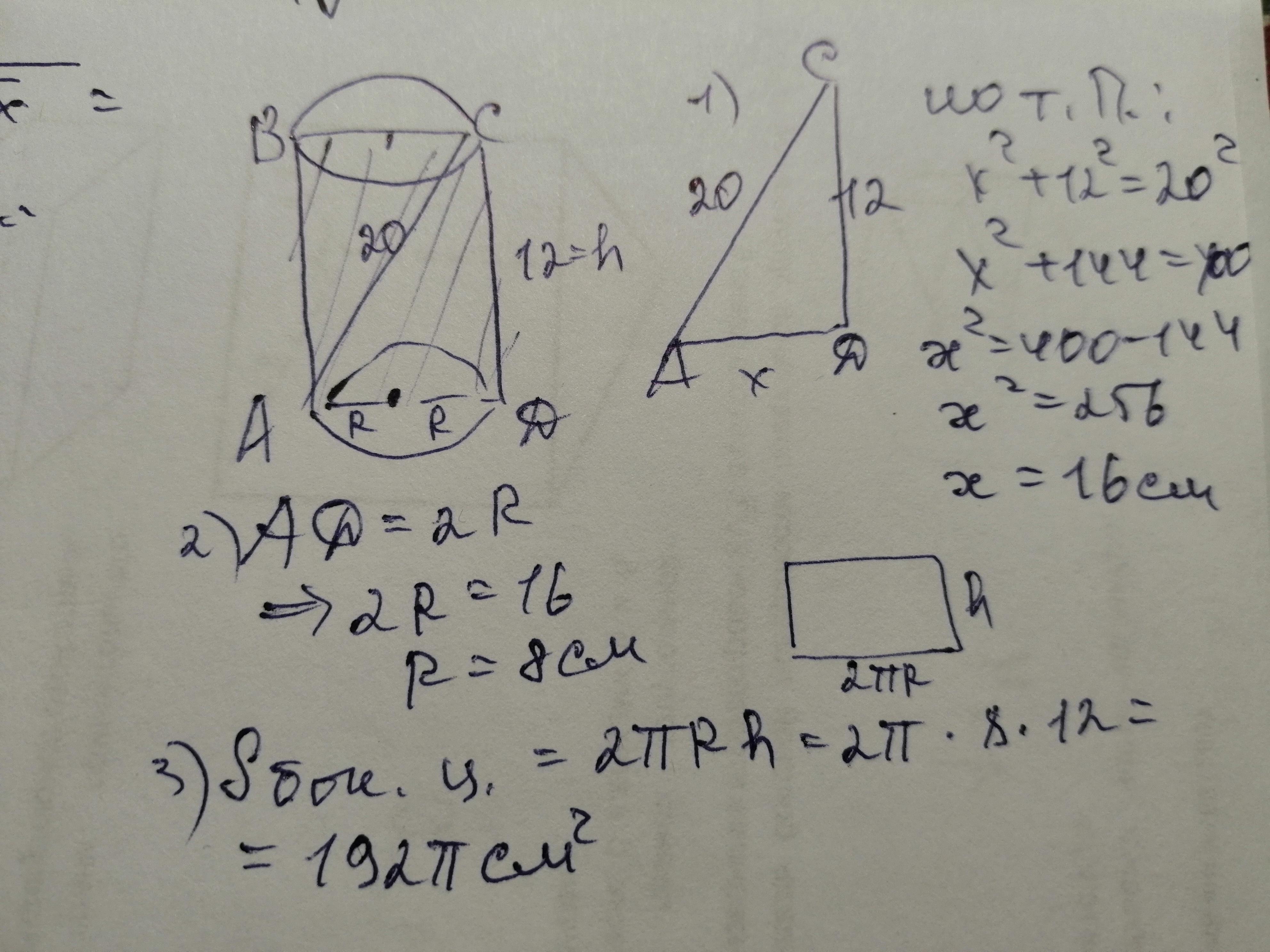 діагональ осьового перерізу циліндра дорівнює 20см, висота 12см, знайти бічну поверхню циліндра❤❤❤❤❤❤