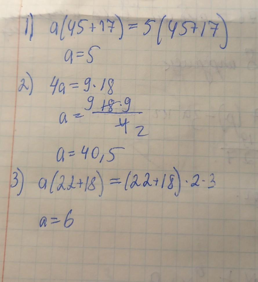 4 При каких значениях аверно равенство? 1) a* (45 +17) = 5*45 +5*17 2) 5*0+ 4* a = 9*18 3) 22*a + 18*a = (22 + 18)* 2*3 пж срочно надо