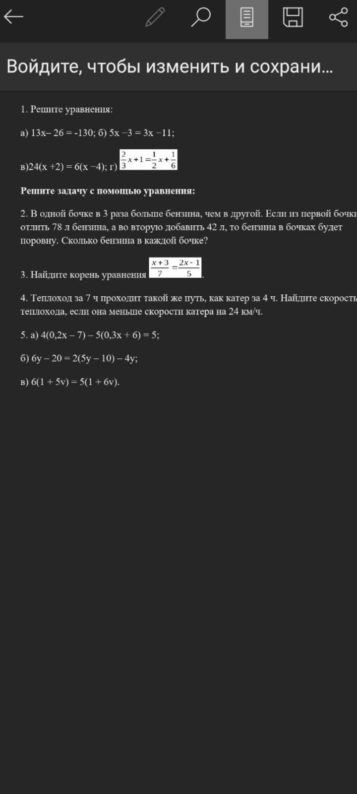 2) Пусть во второй бочке было х литров бензина, тогда в первой бочке было 3х литров. Известно, что если из первой бочки отлить 78 литров, то там останется (3х - 78)литров, а во вторую бочку добавить 42 литра, то там будет (х + 42) литра, и после этого бензина в обеих бочках будет одинаковое количество литров. Составим уравнение и решим его.