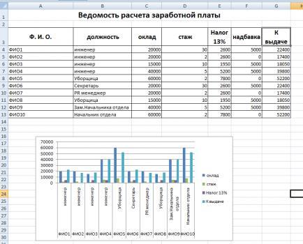 Для отдела из 10 человек составить ведомость расчета заработной платы. Таблица содержит следующие сведения: Ф.И.О., должность, оклад, стаж работы. Для каждого человека посчитать подоходный налог 13%, надбавку 5000 руб., если стаж работы более 3 лет и сумму к выдаче. Построить диаграмму, показывающую з/плату каждого сотрудника