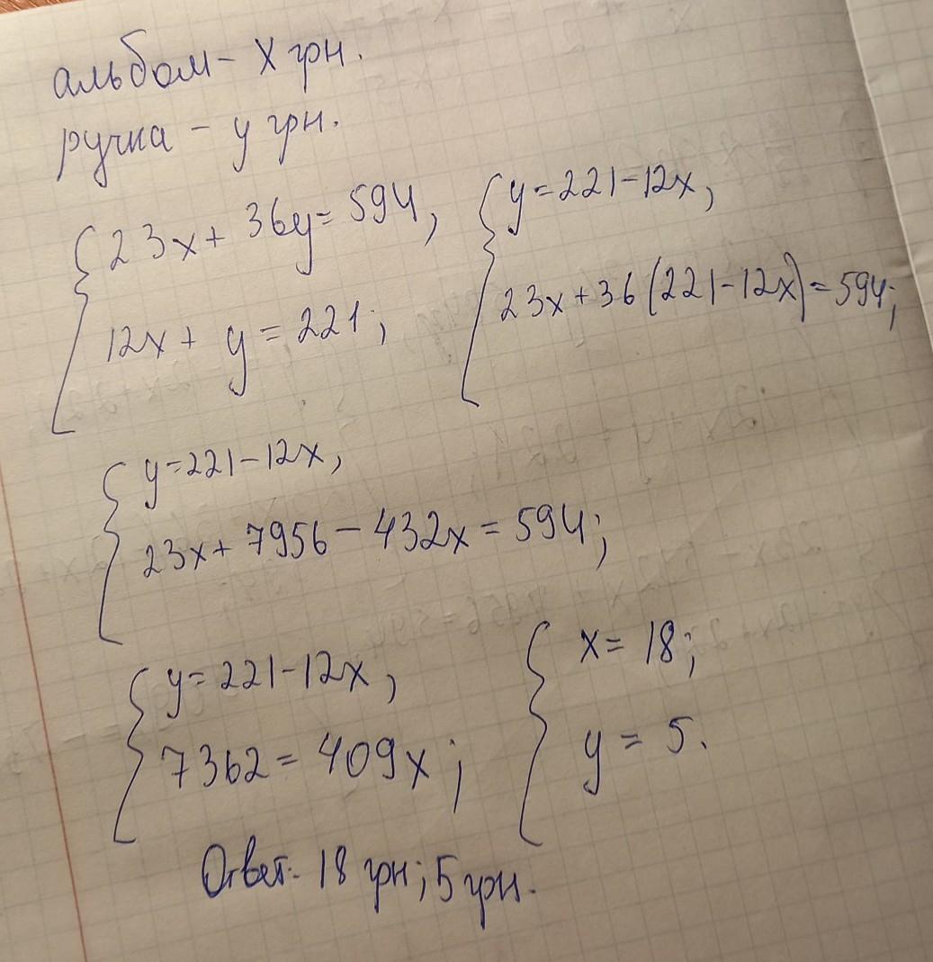 Нехай х - вартість одного альбому, а у - вартість однієї ручки.