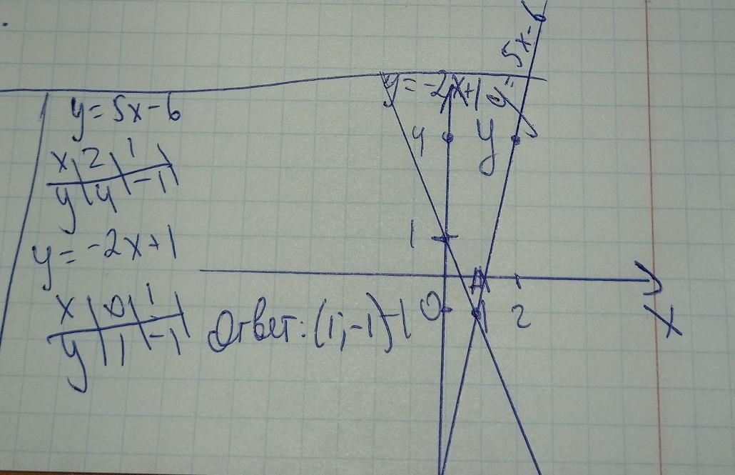 побудуйте в одній системі координат графік функції у= 5×- 6 і у=-2×+1 та знайдіть координати точки іхнього перетину