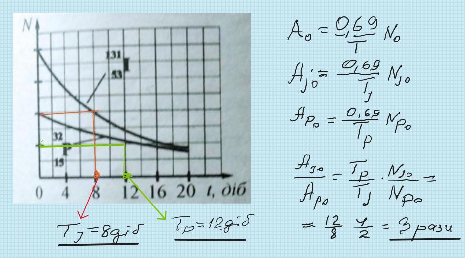 Активиність у початковий момеит iзотопiв Йоду у 3 рази бітьша від активиості iзотопiв Фосфору.