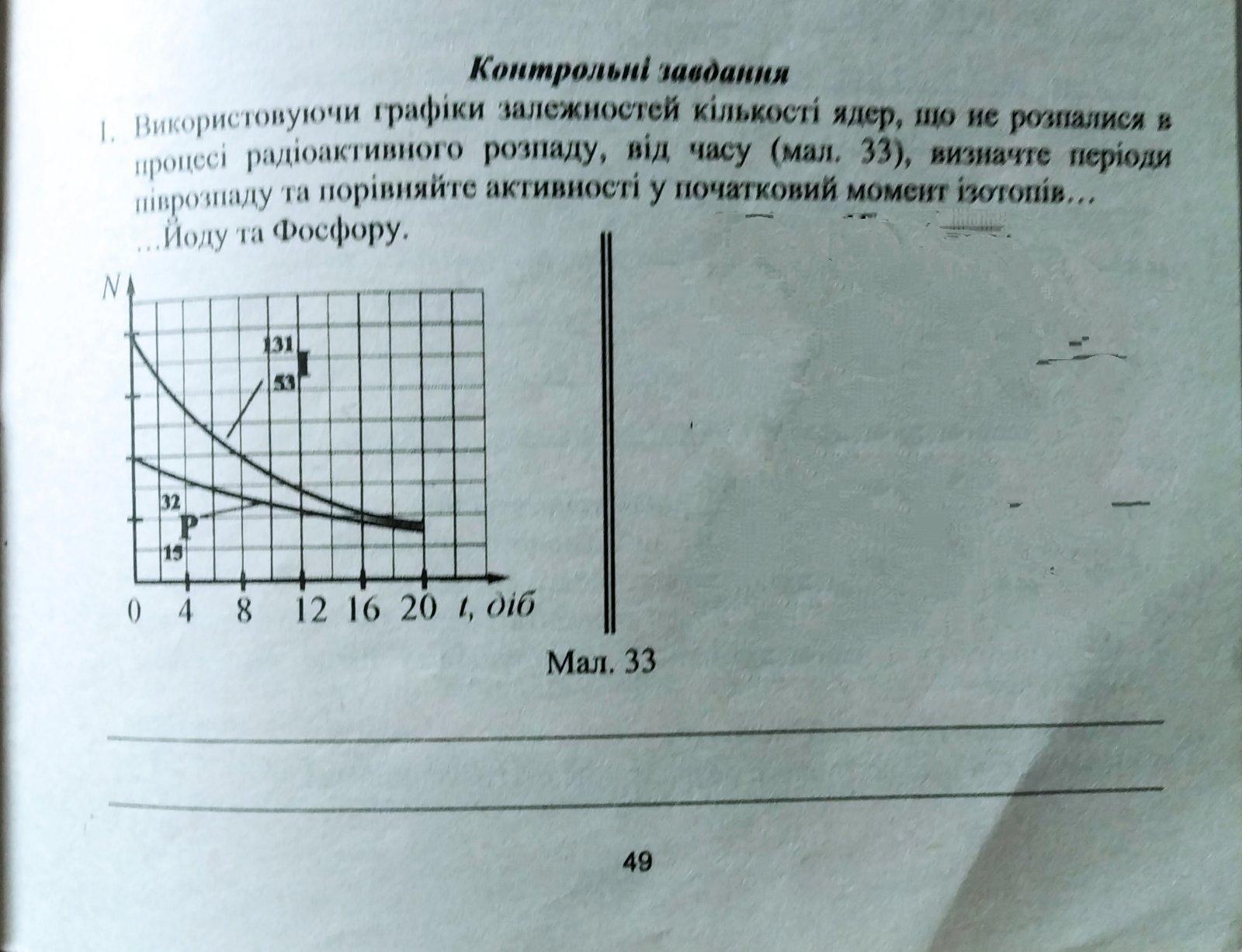 Використовуючи графіки залежиостей кількості ядер, що не розпалися в процесі радіоактивного розпаду, від часу (мал. 33), визначте періоди пірознаду та порівняйте активиості у початковий момеит iзотопiв Йоду та Фосфору.