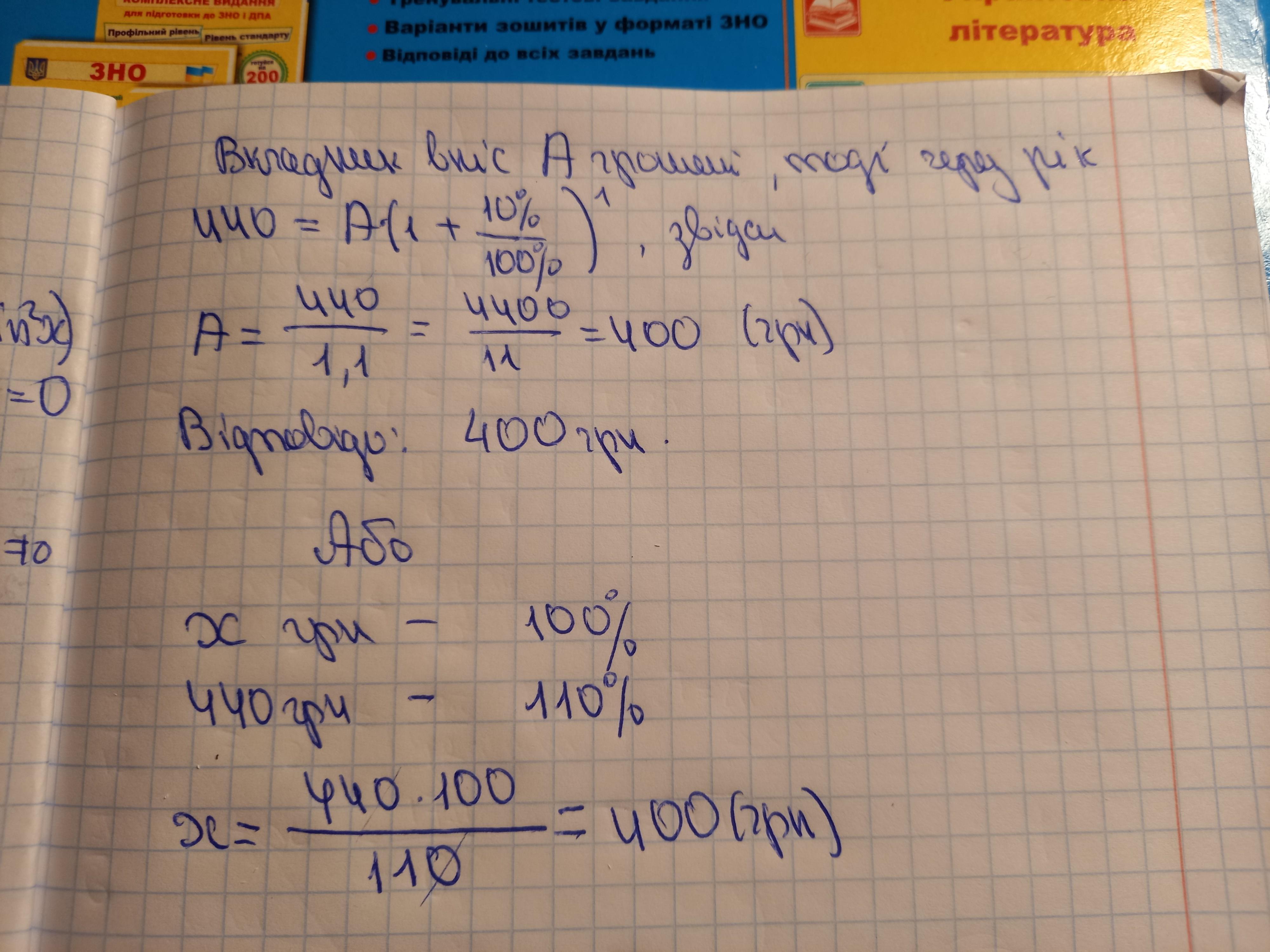 В ощадному банку грошовий внесок зростає на 10% щороку . Скільки грошей вкладник вніс на рахунок якщо через рік сума сягає 440 грн ?