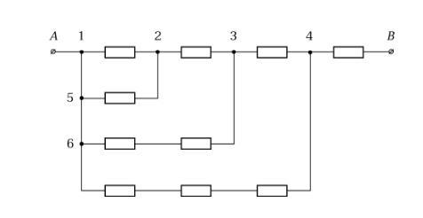 Участок AB электрической цепи состоит из одинаковых резисторов. Его сопротивление равно R1=219 Ом. Известно, что если перерезать провод в некоторой точке на участке AB, то его сопротивление станет равным R2=340 Ом. Укажите участок/участки, где находится эта точка.