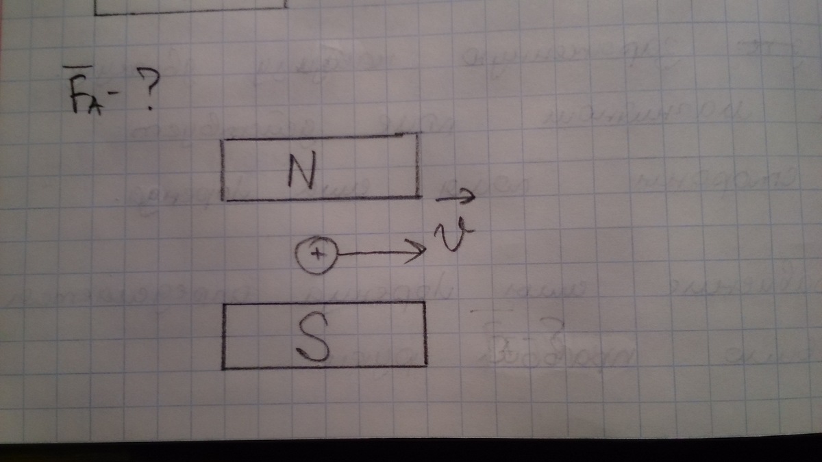 По правилу левой руки: четыре пальца по скорости, силовые линии поля входят в ладонь (от северного полюса к южному), т.е. ладонь вверх