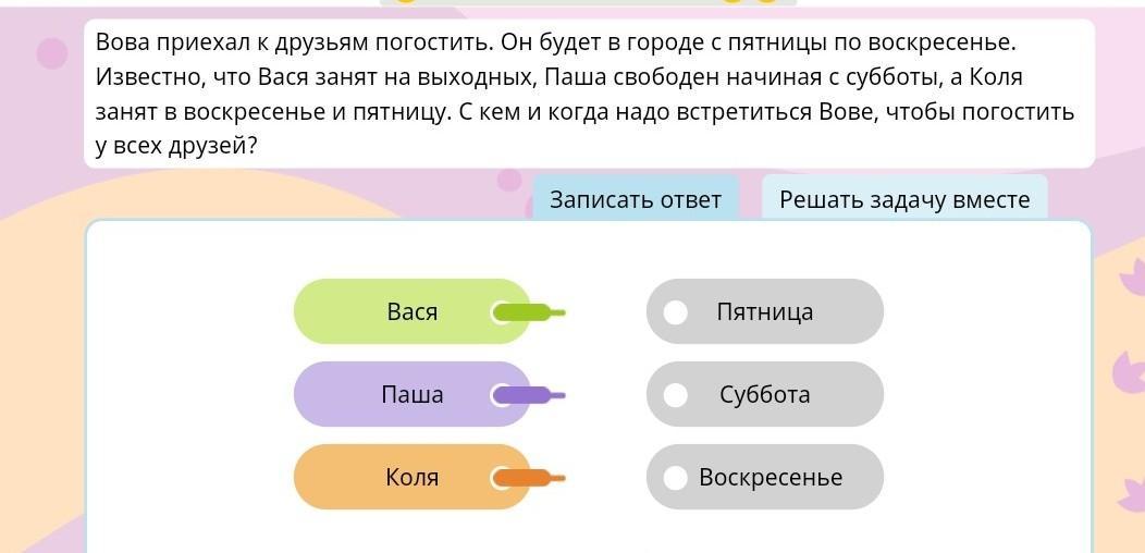 Вова приехал к друзьям погостить. Он будет в городе с пятницы по воскресенье. Известно, что Вася занят на выходных, Паша свободен начиная с субботы, а Коля занят в воскресенье и пятницу. С кем и когда надо встретиться Вове, чтобы погостить у всех друзей?