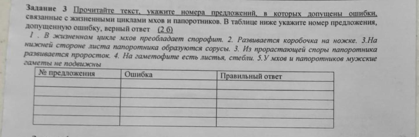 связанные с жизненными циклами мхов и папоротников. В таблице ниже укажите номер предложения, допущенную ошибку и верный ответ.