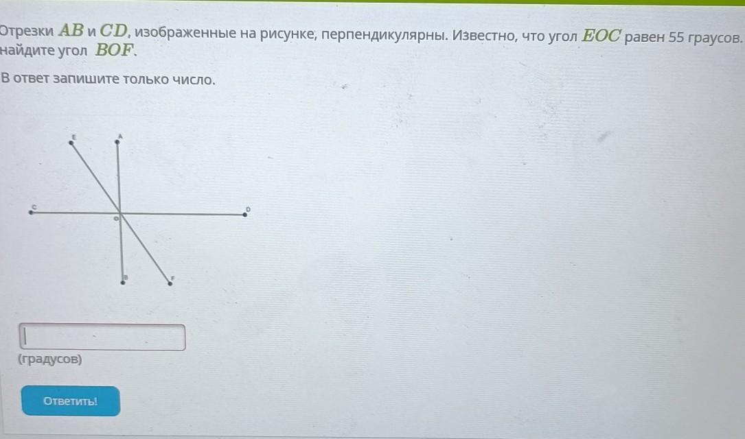 Отрезки AB и CD, изображённые на рисунке, перпендикулярны. Известно, что угол ЕОС равен 55 градусов.