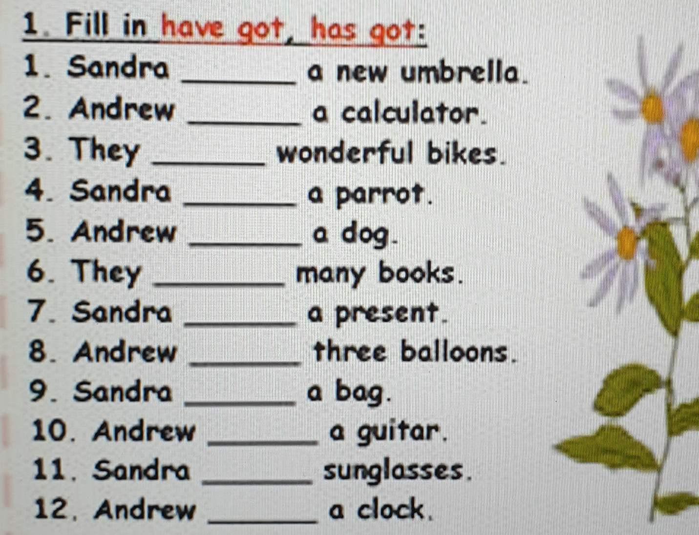 a — 1. Fill in have got, has got: 1. Sandra a new umbrella 2. Andrew a calculator 3. They wonderful bikes. 4. Sandra a parrot. 5. Andrew a dog 6. They many books. 7. Sandra a present. 8. Andrew three balloons. 9. Sandra a bag. 10. Andrew a guitar. 11. Sandra sunglasses 12. Andrew a clock.