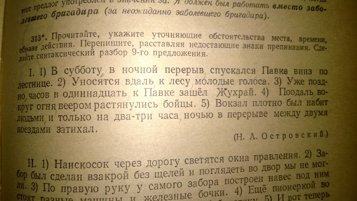 1) В субботу, в ночной перерыв, спускался Павка вниз по лестнице(обстоятельство времени).2)Уносятся вдаль, к лесу, молодые голоса.(обстоятельство места). 2) Уже поздно, часов в одиннадцать, к Павке зашел Жухрай.(обстоятельство времени). 4) Поодаль, вокруг огня, веером растянулись бойцы(обстоятельство места). 5) Вокзал плотно был набит людьми и только на два-три часа ночью, в перерыве между двумя поездами, затихал.(обстоятельство образа действия)