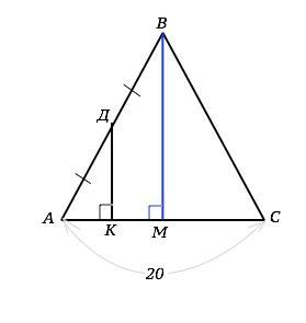 Проведя высоту ВМ ( она же медиана и биссектриса равнобедренного треугольника), получим прямоугольный ∆ АВМ, подобный ∆ АДК по двум углам ( угол А - общий, и ∠ К=у∠ ВМА=90° ). По условию АД=ДВ; ДК║ВМ по равным соответственным углам, поэтому ДК - средняя линия ∆ АВМ.