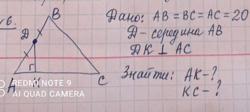 Д - середина АВ; ДК перпендикулярна АС. Найти АК, КС.