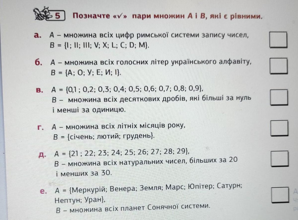5) Позначте «V» пари множин А і В, які є рівними. V а. А — Множина всіх цифр римської системи запису чисел, В = {\; ІІ; ІІ; V; X; L; C; D; М}. 6. А множина всіх голосних літер українського алфавіту, В = {A; 0; У; Е; И; 1}. = В. = A = {0,1; 0,2; 0,3; 0,4; 0,5; 0,6; 0,7; 0,8; 0,9). В — Множина всіх десяткових дробів, які більші за нуль менші за одиницю. Г. А — Множина всіх літніх місяців року, В = {січень; лютий; грудень). = Д. А = {21; 22; 23; 24; 25; 26; 27; 28; 29), В – множина всіх натуральних чисел, більших за 20 і менших за 30. е. А = {Меркурій; Венера; Земля; Марс; Юпітер; Сатурн; Нептун; Уран), В — множина всіх планет Сонячної системи.