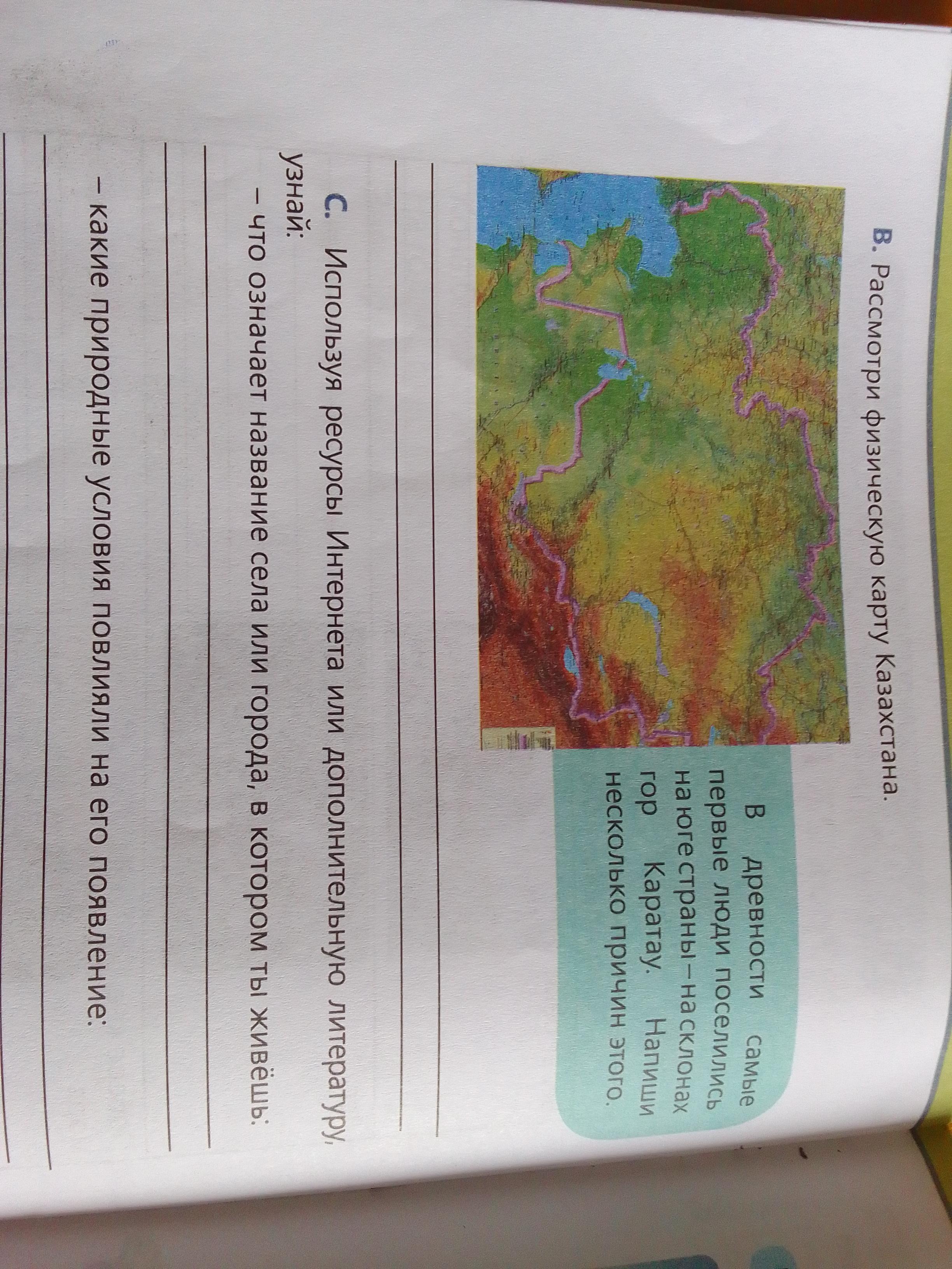 Рассмотри физическую карту Казахстана:В древности самые первые люди поселились на юге страны-на склонах гор Каратау