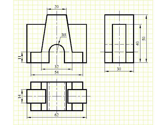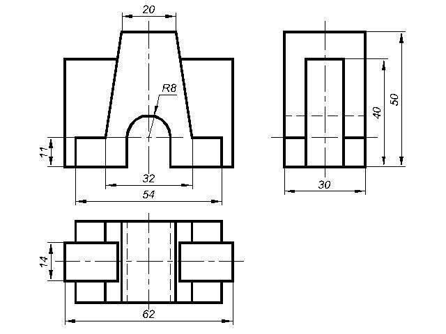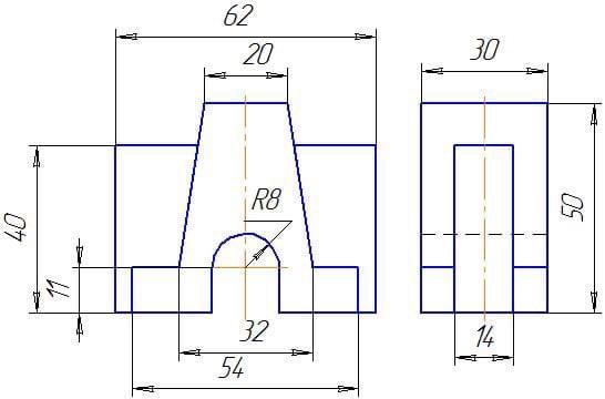 Дана деталь изображенная в 2 проекциях, с боку и прямо. Нужно изобразить в 3-ей проекции (вид с верху)