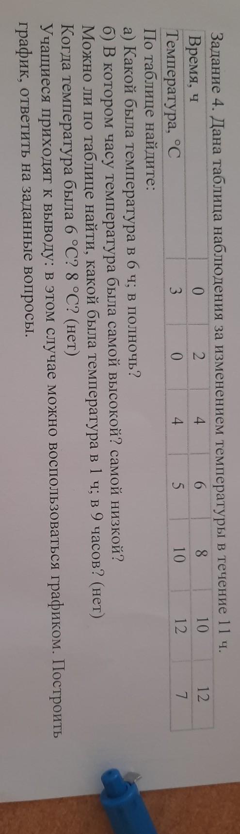 10 Задание 4. Дана таблица наблюдения за изменением температуры в течение 11 ч. Время, ч 0 2 4 6 8 12 Температура, °C 3 о 4 5 10 12 7 По таблице найдите: а) Какой была температура в 6ч; в полночь? б) В котором часу температура была самой высокой? самой низкой? Можно ли по таблице найти, какой была температура в 1 ч; в 9 часов? (нет) Когда температура была 6 °С? 8 °С? (нет) Учащиеся приходят к выводу: в этом случае можно воспользоваться графиком. Построить график, ответить на заданные вопросы. СРОЧНО ПОМОГИТЕ ДАМ 100БАЛЛОЫ