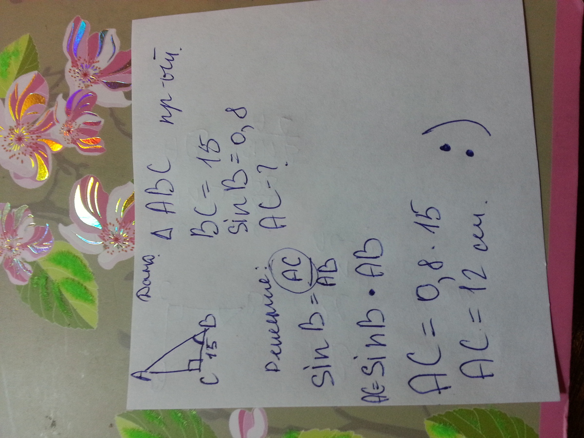 В прямоугольном треугольнике ABC катет. В прямоугольном треугольнике ABC катет BC равен 15 см, sin B = 0,8. Найдите катет AC.